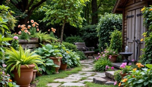 A tranquil garden featuring a dense tapestry of foliage, with emerald ferns unfurling beneath the filtered light of mature deciduous trees