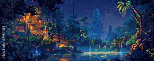 A tranquil night scene featuring a mysterious tropical paradise with glowing water, lush foliage, and illuminated ancient ruins.