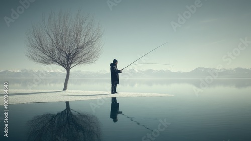A tranquil night with a tree's shadow in the water, brightened by a full moon, showcasing the silhouette of a man engaged in fishing, no people.