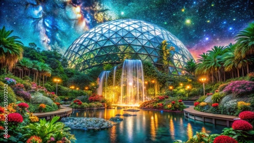 A tranquil oasis with a cascading waterfall, shimmering lights, and a breathtaking view of a starry sky above a geodesic dome.