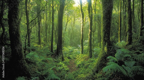 A tranquil pathway winds through a lush forest, where dense moss blankets towering trees and sunlight dapples the foliage, creating a magical atmosphere alive with nature's beauty