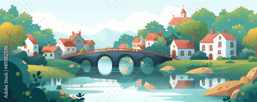 A tranquil riverside town with a wooden bridge spanning the river. Vector flat minimalistic isolated illustration.