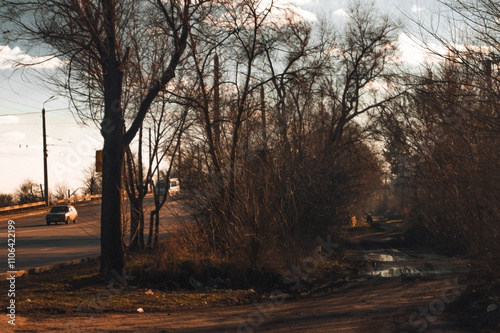 A tranquil roadside scene captures leafless trees lining the road, vehicles passing by, and a peaceful waterway reflecting soft clouds. Sunlight casts gentle shadows, enhancing the serene atmosphere.