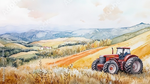 A tranquil rural landscape featuring rolling green hills, a distant red barn, and a tractor under a clear sky at midday