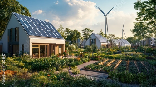 A tranquil scene of a community garden and energy-efficient homes with rooftop solar panels, wind turbines in the distance, evoking a net zero lifestyle