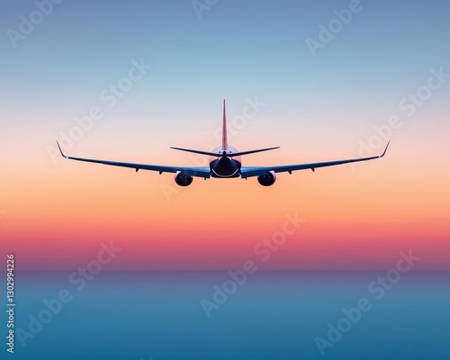 A tranquil scene of an airplane flying into a horizon of vivid sunrise gradients