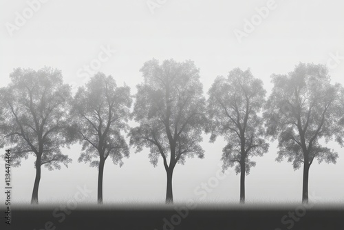 A tranquil scene of five trees in a foggy landscape, creating a serene and atmospheric visual effect.