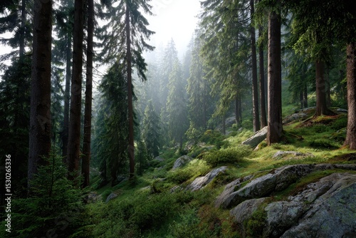 A tranquil scene of tall trees in a lush forest with fog in the distance view scene