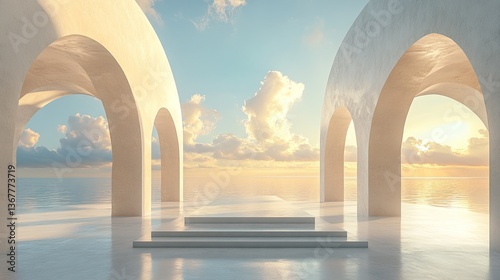 A tranquil space with arches and steps leading to a bright, cloud-filled horizon