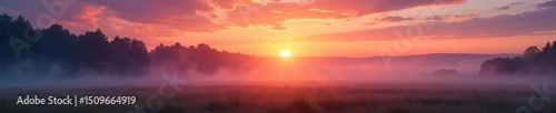 A tranquil sunrise paints the sky with vibrant hues, casting a warm glow over a serene, mist-shrouded landscape Perfect for travel, nature, and peaceful backgrounds , sunset, fog