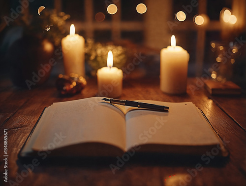 A tranquil workspace featuring an open book, fountain pen, and candles, creating a serene environment that's perfect for deep thought and relaxing contemplation.