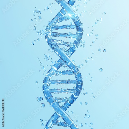 A translucent, helix-shaped DNA structure, rendered in water, is depicted against a light blue background, surrounded by small water droplets