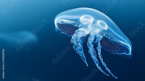 A translucent jellyfish gracefully drifting in deep ocean waters.