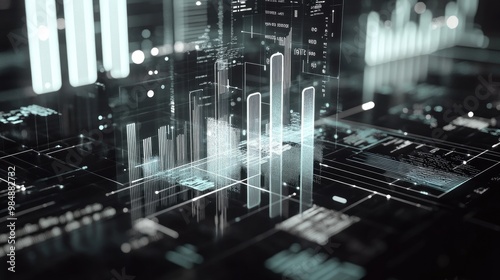 A transparent 3D bar chart floating in a digital space, with bars of different heights representing financial performance, surrounded by data points and futuristic icons.