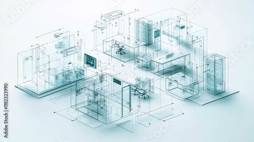 A transparent architectural diagram of interconnected office spaces and furniture layouts.