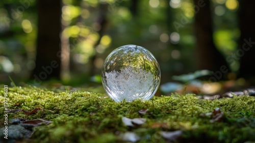 A transparent crystal globe placed on lush green moss in a forest, symbolizing global care for nature and the planet sustainable future.