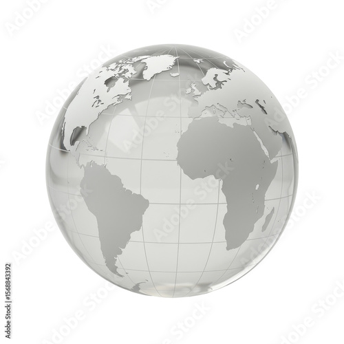 A transparent globe showcasing the continents of Africa and Europe, with a subtle grid pattern and reflections