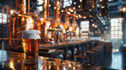 A transparent large glass filled with fresh beer on the background of a modern brewery with copper tanks and pipes. Production of hoppy beer. Beverage, industry concept.