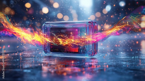 A transparent music player floating in mid-air, with colorful sound waves emanating from it and a blurred cityscape in the background.