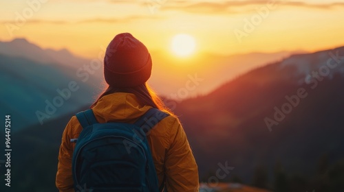 A traveler enjoys a stunning sunset view in the mountains, capturing the essence of adventure and exploration in nature.
