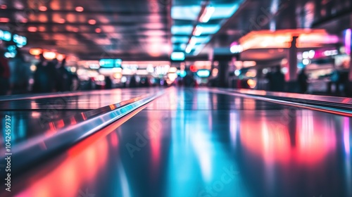 A traveler walks through a bustling airport terminal with luggage on a reflective floor during evening hours