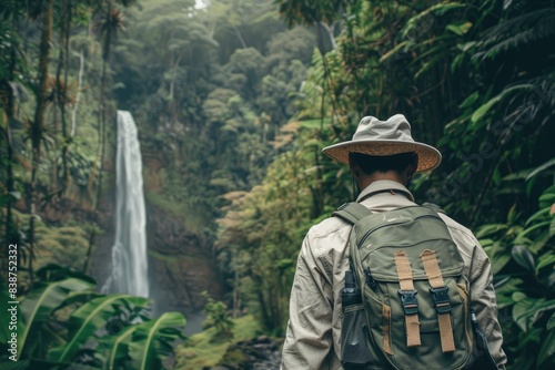 A traveler with a backpack admiring at a majestic waterfall in a lush tropical forest setting