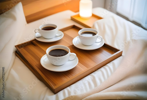 A tray with three cups of black coffee on a wooden surface in a cozy bedroom setting