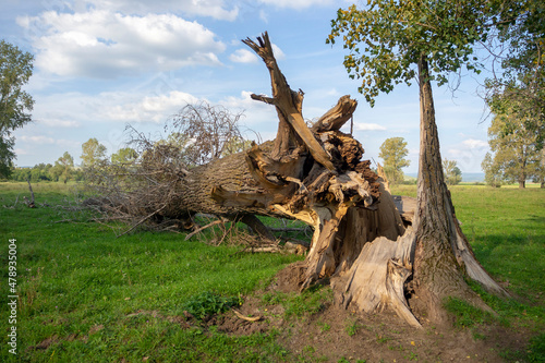 A tree broken by a hurricane. Close-up of an old tree trunk that fell to the ground from the effects of a storm.