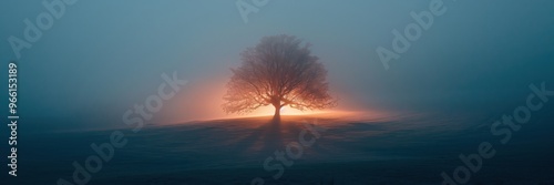 A tree is lit up by the sun in the middle of a foggy field