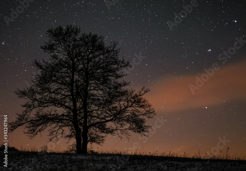 A tree stands on a horizon and a night sky with stars in the background