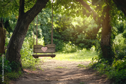 A tree swing with a heart-shaped seat, set in a picturesque garden, postcard design with space for greetings. Valentine concept