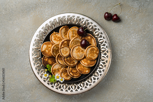 A trendy homemade breakfast with tiny pancakes close-up. Mini pancakes, cherries, tea on the table in an openwork plate