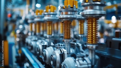 A truck engine block with massive pistons and rugged components, photographed in a factory