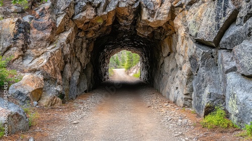 A tunnel carved into a mountain, with rock walls and a faint light at the end, offering a quiet, peaceful passage through nature.