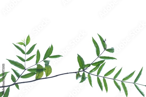 A twig of tropical plant leaves with branches on white isolated background for green foliage backdrop