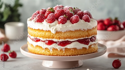 A two-layer strawberry cake with whipped cream and strawberry jam on a cake stand.