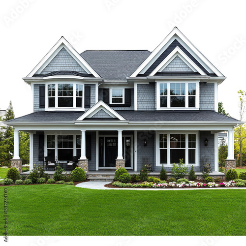A two-story gray house with white trim, multiple windows, a large porch with pillars, and landscaped garden beds in front of a well-maintained green lawn. Png, Transparent background.
