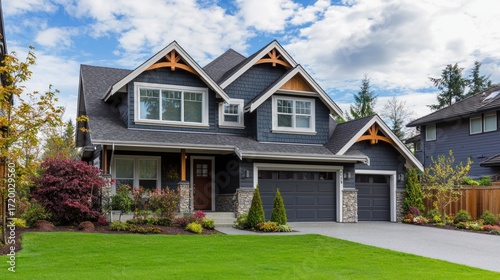 A two-story house with a gray roof and dark blue siding, featuring a front porch and a garage with a black door.