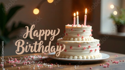 A two-tier birthday cake with white frosting decorated with pink sprinkles and candles rests on a plate in a warm inviting setting. Soft lights add to the festive atmosphere.