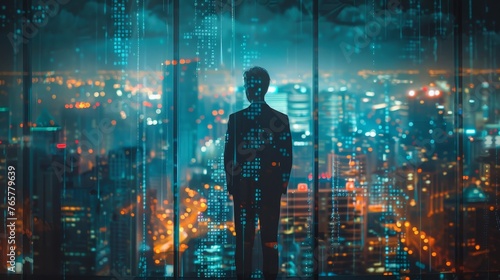 A UHD photo of a CEO or executive looking out of a window at a city skyline, with a double exposure effect