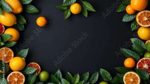 A unique frame made of assorted citrus fruits and fresh leaves on a dark background, centerpiece, decoration, natural