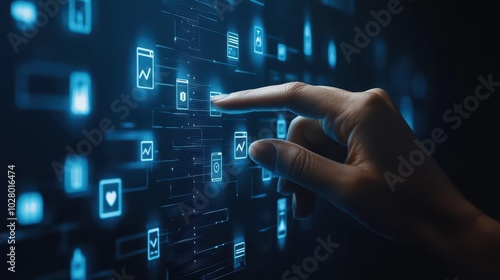 A user interacting with futuristic digital interface technology, showcasing advanced connectivity and data analysis.