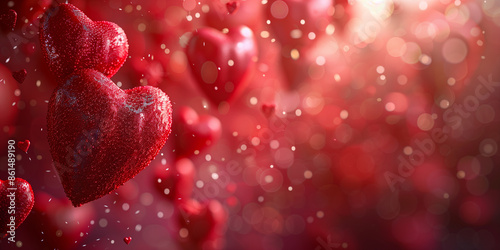 A Valentine's Day banner featuring two red hearts covered in water droplets, set against a vibrant bokeh background with warm red and pink tones.