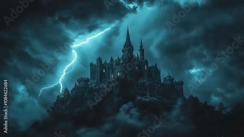A vampire's gothic castle on a hill, illuminated by lightning under a stormy sky