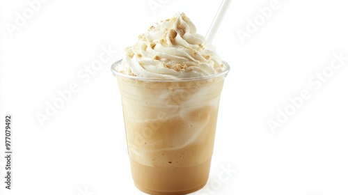 A vanilla frappuccino in a clear cup with whipped cream and a straw, isolated on a white background.