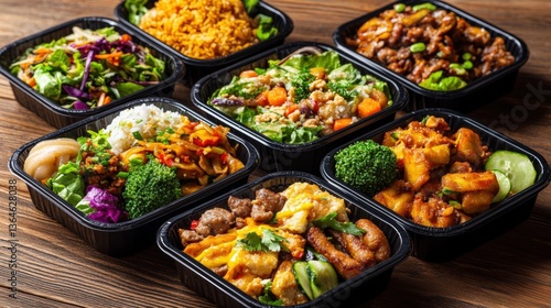 A Variety of Asian-Inspired Meal Prep Containers Filled with Rice Vegetables Meat and Other Dishes on a Dark Wooden Surface for Culinary Delight