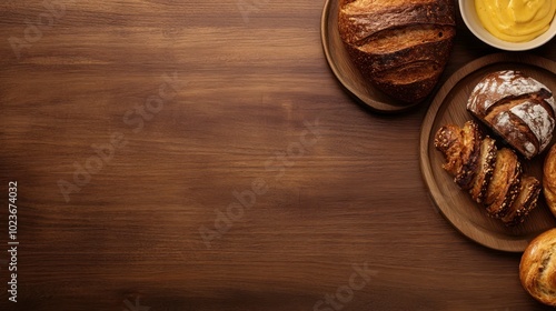A Variety of Breads and a Bowl of Yellow Sauce on a Wooden Tabletop