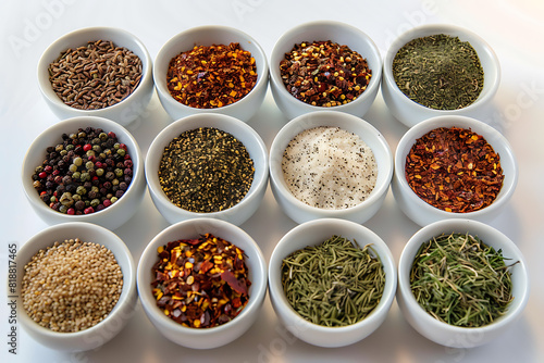 A variety of colorful seasonings displayed, showcasing diverse spices and herbs for culinary use