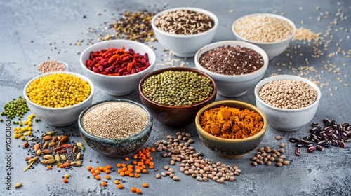A variety of different colored beans and nuts are displayed in bowls on a gray surface. The bowls are arranged in a way that creates a sense of abundance and variety