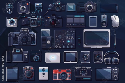 A variety of electronic devices and gadgets on a dark background. Suitable for technology concept designs